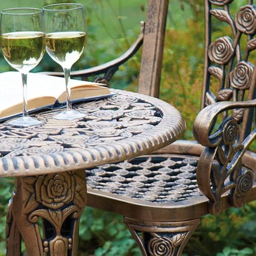 This classic Rose Bistro Set with two comfy armchairs makes an ideal choice for those who enjoy sitting out in the garden or on the patio. Designed in a vintage style, this set is light-weight and easier to move than its cast iron predecessor. Manufactured from UV-stabilised polyurethane it is not only strong and durable but also resistant to all types of weather. Easy home assembly required.