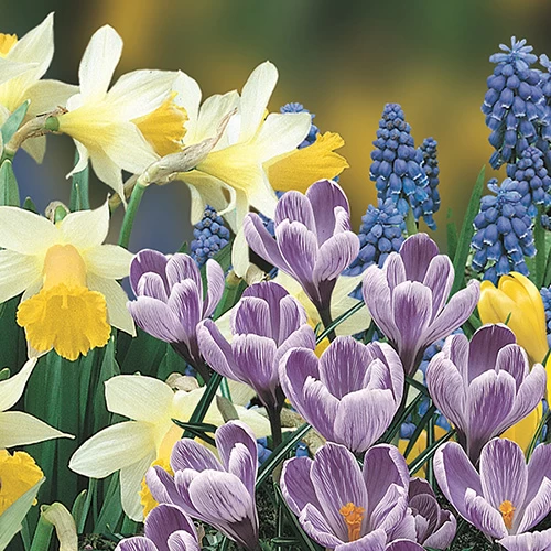 In total, this kit contains 6 x Tulip Zwanenburg, 3 x Tulip Yellow Baby, 3 x Narcissus Botanical Hawera, 3 x Narcissus Botanical Minnow, 6 x Crocus Ruby Giant, 5 x Scilla Siberica White, 7 x Puschkinia and 5 x Muscari Armeniacum.