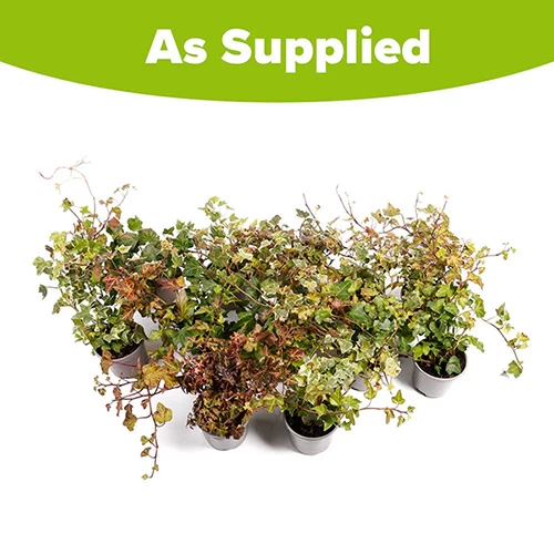 This collection features a duo of ivies, including a solid green variety, and another slow grower with variegated leaves and golden edges.