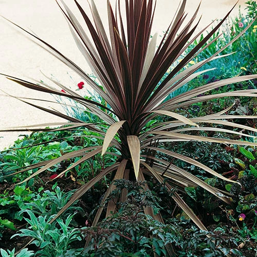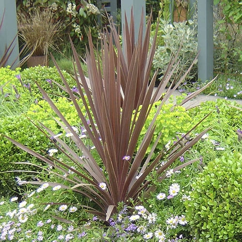 With arching deep red sword-shaped leaves, the Cordyline ?Red Star? is a splendid plant for the patio, contrasting beautifully with the more familiar greens of other plants and bringing a tropical feel to the garden.