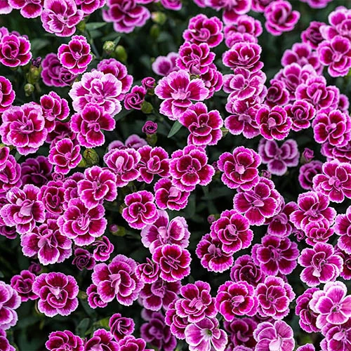 Dianthus ‘Pink Kisses’ is a caryophyllus variety of dianthus that is compact grower, with heavily perfumed blooms, that produces large, double blooms that will fill your bed, borders, or patio pots with their eye-catching and pretty pink tones.