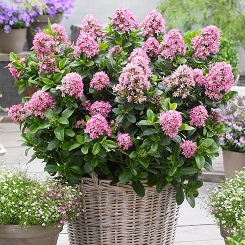 Producing clusters of candy pink flowers in early summer, often reblooming well in autumn, ?Pink Elle? is ideal for forming a decorative low hedge or filling in gaps and in beds and borders with its barrage of flowers contrasting against year-round evergreen foliage.