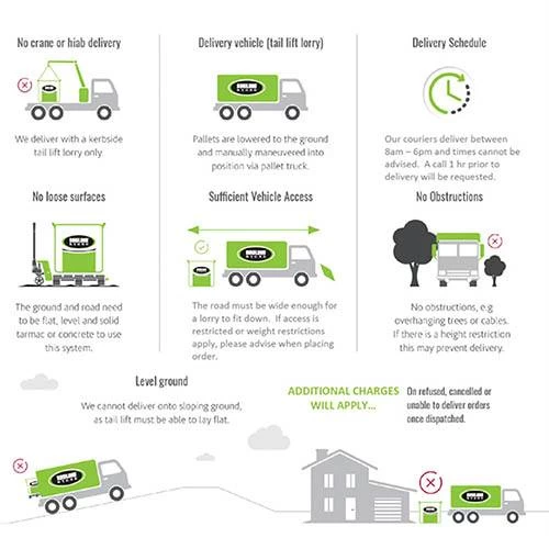 - Deliveries will be unloaded by tail lift from the road – ensure the road is flat and level.