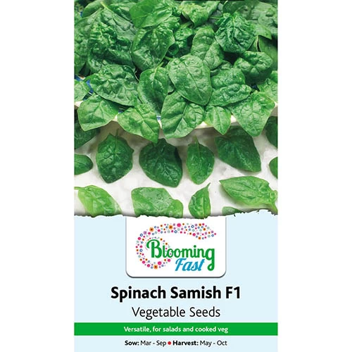 - Spinach ‘Samish F1’ – Great for cooking in a variety of savoury dishes or eaten raw in salads, spinach ‘Samish’ can be picked as either baby spinach or mature leaves. An excellent source of vitamin A, and good for vitamin C and folate and are a must have for a healthy diet. ‘Samish’ also have an outstanding mildew resistance which ensures a long harvest period. Supplied as 1 packet of seeds (approx. 200).