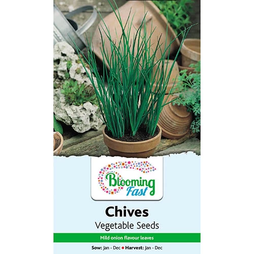 - Chives – Perfect for growing in raised beds or your windowsill, they have a mild onion flavoured leaves are superb for dairy dishes, salads, and many other recipes. The decorative flowers can also be eaten and make a pretty garnish plus they are attractive to garden pollinators and will also repel insect pests. Supplied as 1 packet of seeds (approx. 500).