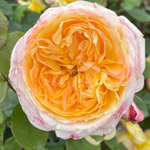 With pink shades in the outer petals and yellow ambers in the centre of the flower this is a classical colour combination, and one we never tire of. The perfume hits you hard, and this repeat flowering inspiring yellow bush rose will take pride of place in any garden.