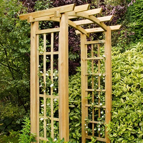 The stylish Ryeford Garden Arch has an elegant curved raftered roof that will create a stunning garden or walkway entrance. The trellis side panels are the perfect place to grow climbing plants such as wisteria to create a colourful, sweet-smelling focal point in your garden.