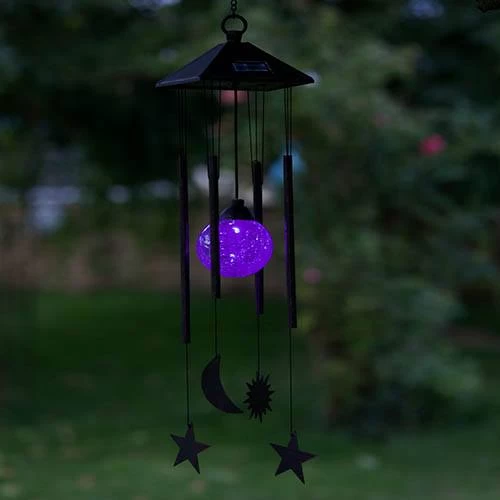 This solar powered wind-chime beautifully enhances archways or trees with a relaxing chime sound. It charges through the solar panel in direct sunlight and will automatically illuminate the crackle globe at night.