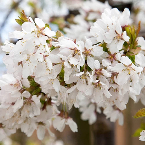 In spring, when the flowers appear, the ?Snow Showers? is a sight to behold: the pendulous branches are awash with the most beautiful display of pure white flowers. The weeping branches cascade downwards and are covered in the single, pure-white flowers. The flowers are popular with the first of the spring bees and the flowers have a light and fresh scent.
