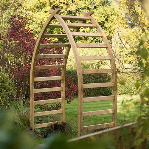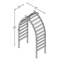 The arch feature posts with an extended curved section that can only be achieved using carefully cut and laminated timber. The posts are linked with thick section rails and cross at the top to create a graceful and unique garden structure.